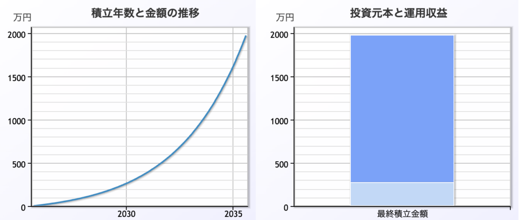 理論上は10年で約1970万円ほどに達する可能性があり、ほぼ資産2000万円を達成できるような金額になってきます。