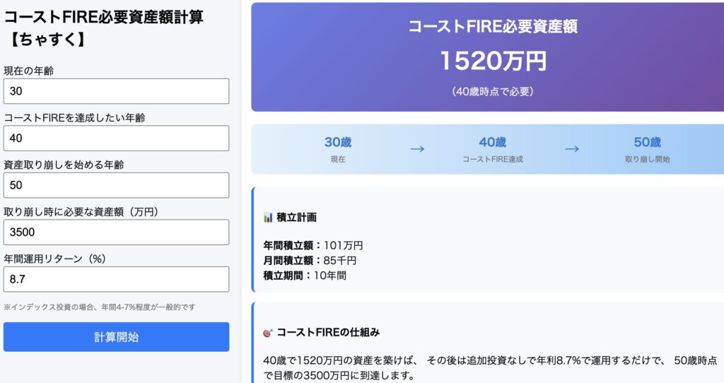 実際に上記の条件を入力すると、コーストFIREを達成したい40歳時点でいくらの運用資産が必要なのか出力されます↓