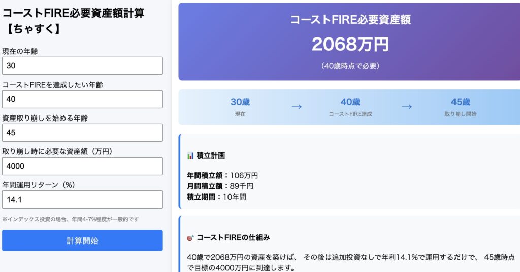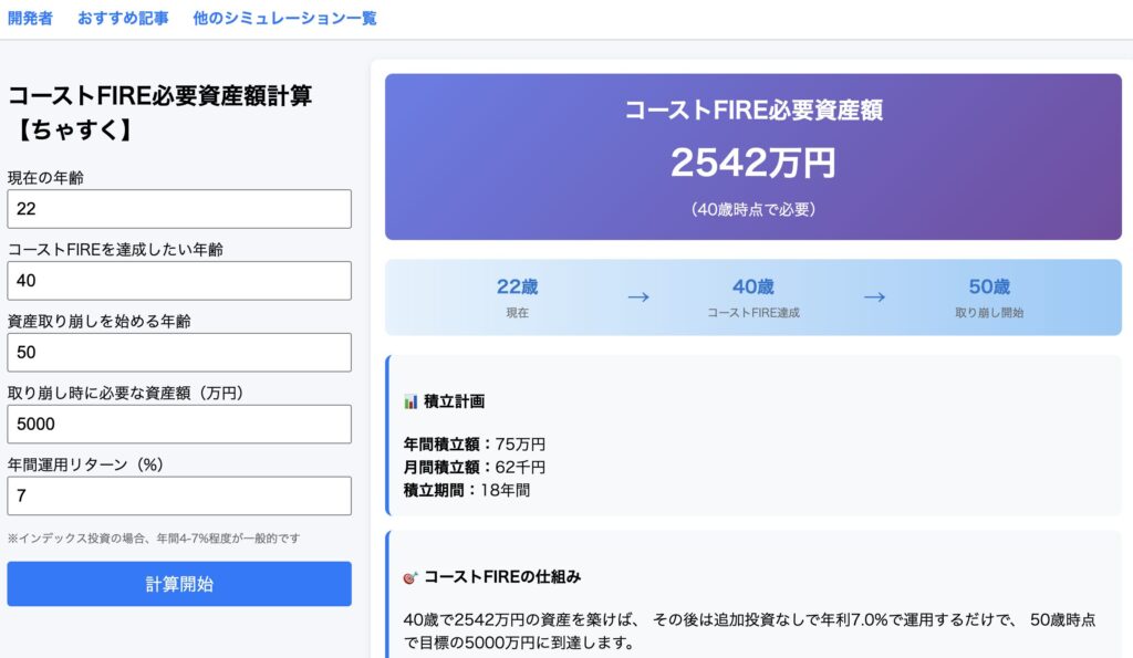 このコーストFIREシミュレーター(上画像)は私が作ったシミュレーターの1つで、「現在の年齢」「コーストFIREを達成したい年齢」「資産を取り崩し始める年齢」「取り崩し時に必要な資産額」「年間運用リターン」を入力することで「コーストFIREを達成したい年齢でいくらあれば新規の積立投資を辞めても大丈夫か」が分かるようになります。