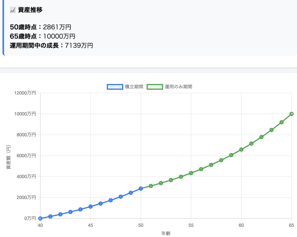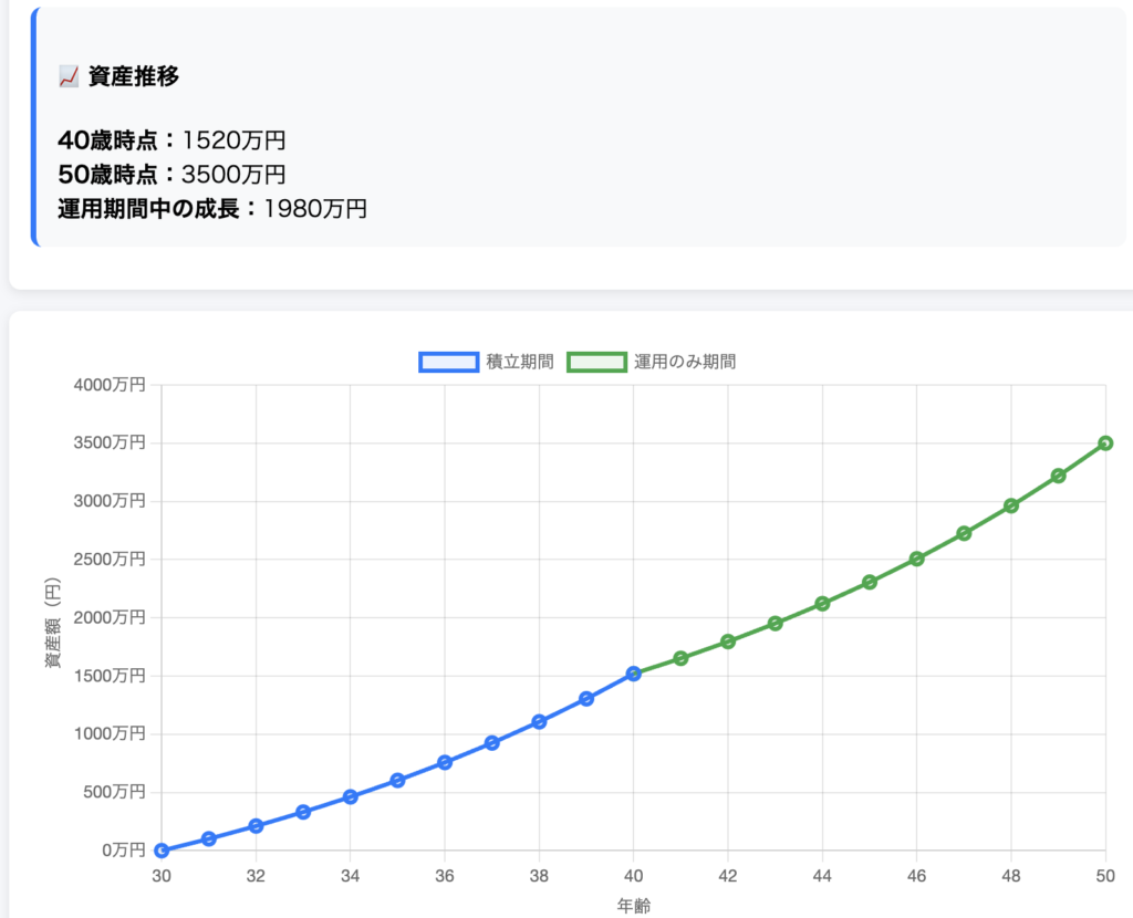 今回の例であれば40歳で運用資産1520万円を達成できれば新規の積立投資を辞めても50歳時点で約5000万円の運用資産を見込めるようになります。