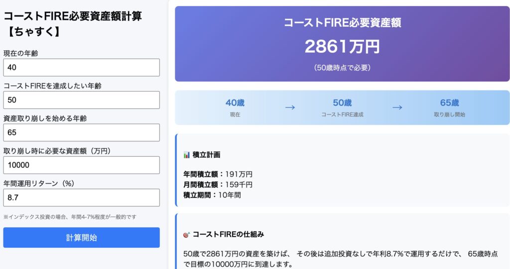 本来のコーストFIREであれば老後資金を目的とした資産形成ですが、このコーストFIREシミュレーターであれば老後資金だけでなく、「50歳でFIREしたい」「40代でサイドFIREやバリスタFIREしたい」といった場合でもいくらになったら積立投資を辞めても良いのか分かるようになります。