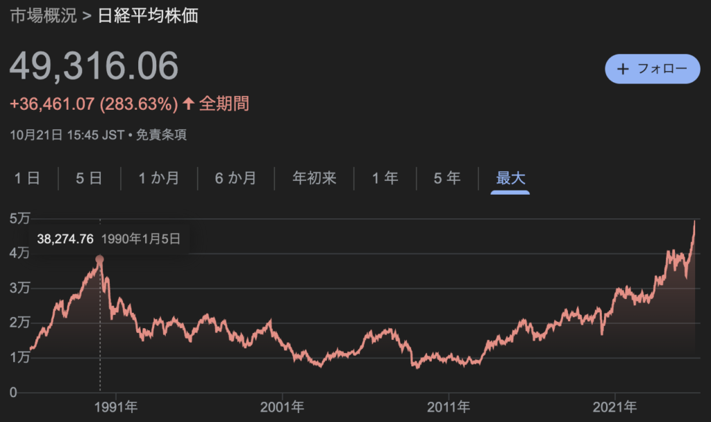 例えば最近だと日経平均が5万円に届きそうなくらい伸びていますが、1990年〜2010年くらいまではほぼ右肩下がりでした。