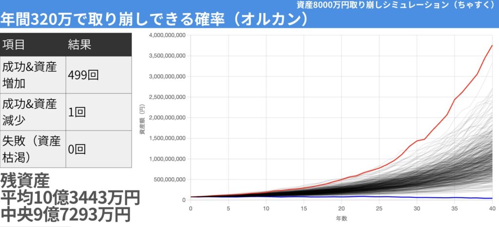 実際に資産8000万円をオルカンで運用しながら年間320万円を取り崩した場合、40年後も資産が残る成功確率は100%、さらに資産が増加し続ける確率は99.8%にもなります。(詳細はこちら)