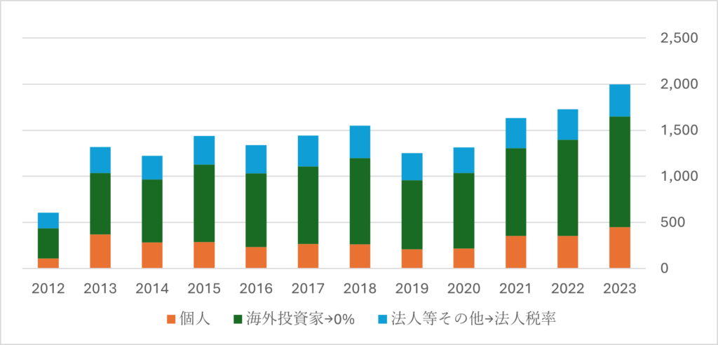 金融所得課税が20%へ引き上げられた2014年のタイミングで日本の個人投資家による売買は減っており、その後2015年には代わりに海外投資家の売買が活発になっています。