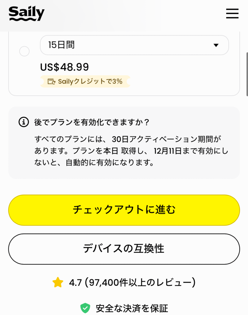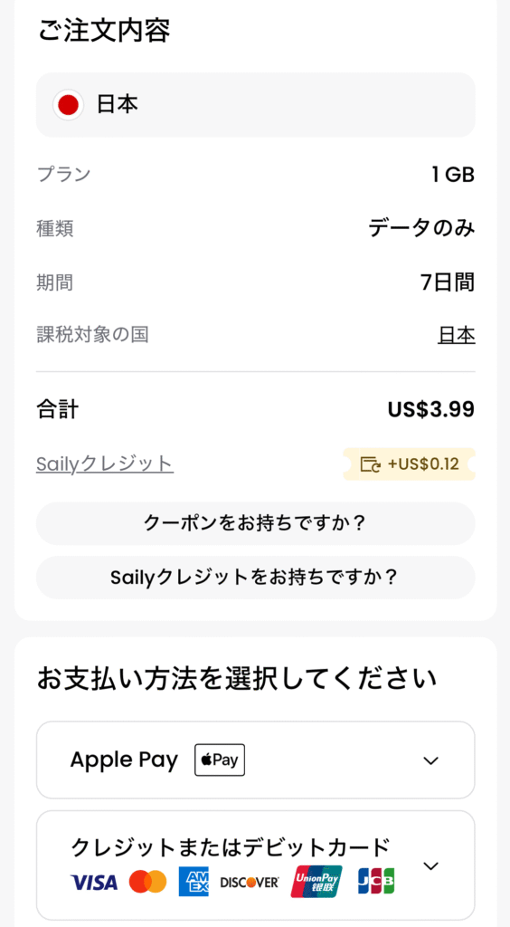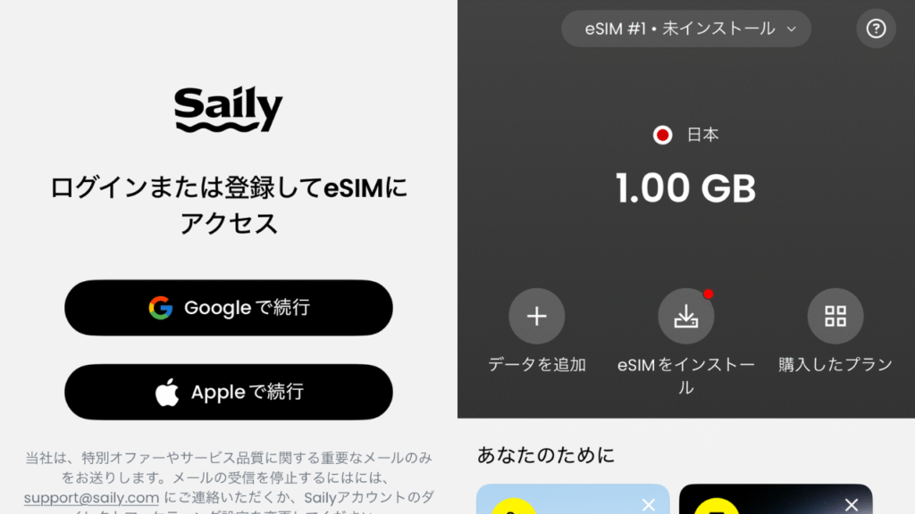 ここで登録したアカウントにeSIMの購入が紐づけられ、後でインストールするSailyのアプリでも同じアカウントでログインする必要があります。