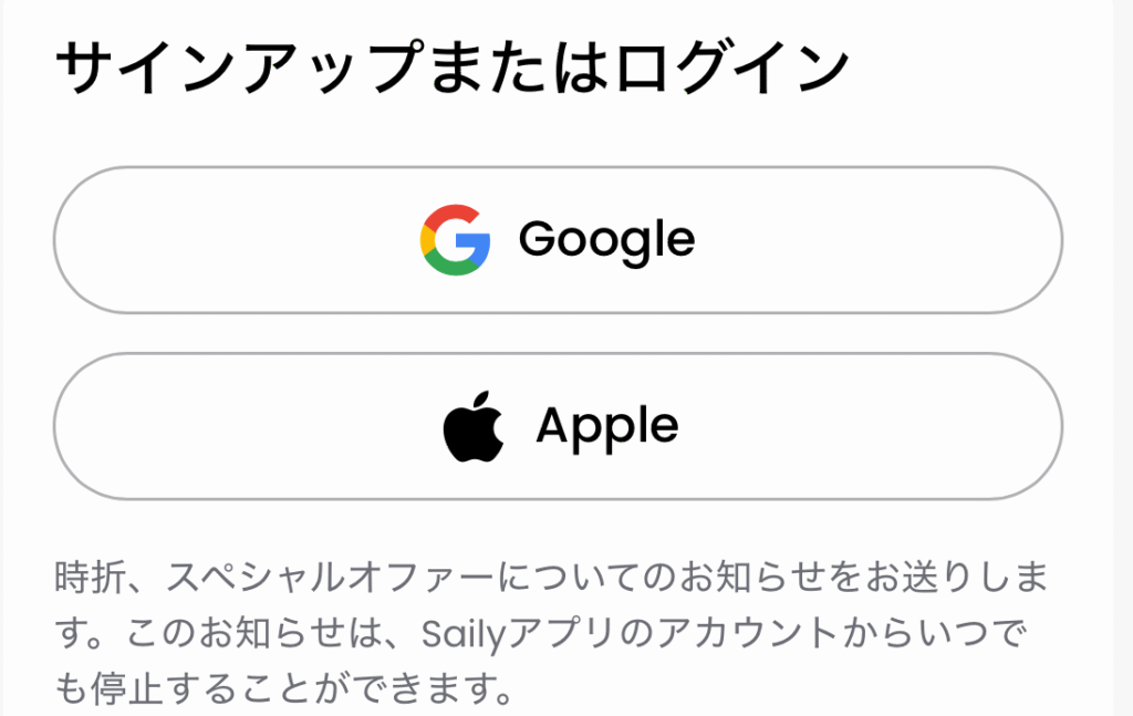 Sailyのアプリをインストールすると下の左画像のように、まずはログインが表示されます。