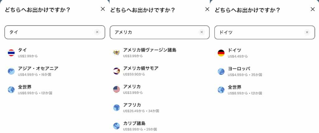 上画像にもある「目的地を検索」でeSIMを利用したい地域や国名を入力すると、下画像のように対応するeSIMのプランが表示されます。