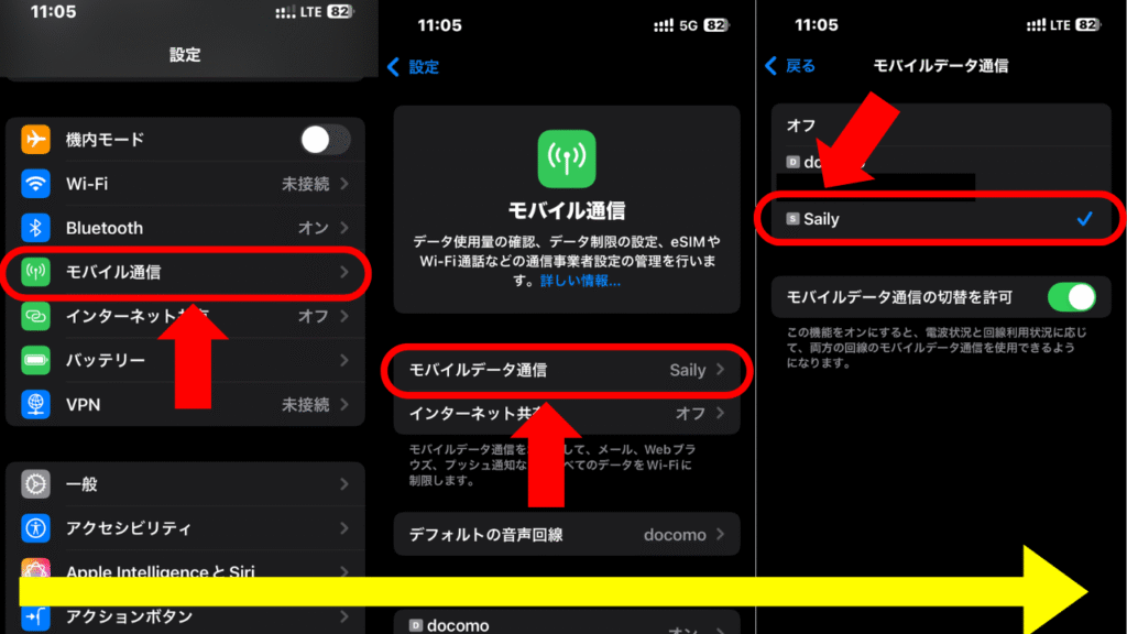 具体的な切り替えの流れは下画像の通りで、「設定」>「モバイル通信」>「モバイルデータ通信」>「SailyのeSIM(下画像ではSailyの名称)」へチェックするだけです。