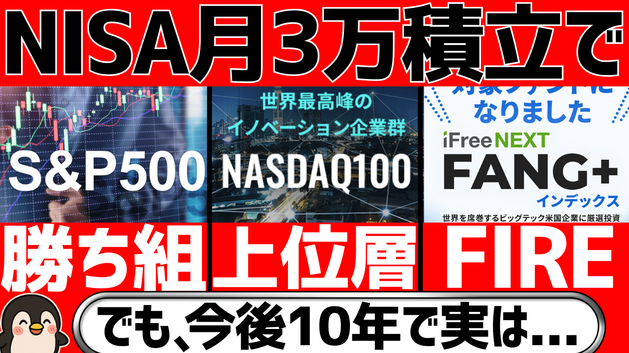 今回は新NISAで人気なS&P500、NASDAQ100、FANG+へ毎月3万円積立すると、人生勝ち組になれるかどうか検証していきます。