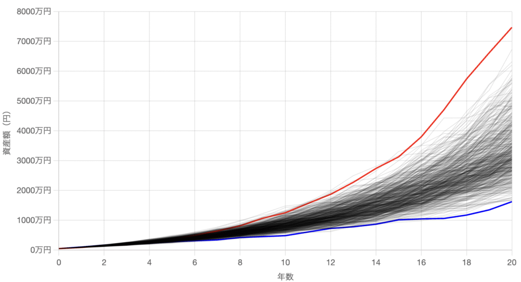 このシミュレーション方法であれば過去の実績を踏襲しつつ、どのような資産額の推移があり得るのか色々なパターンを考えることが可能です。