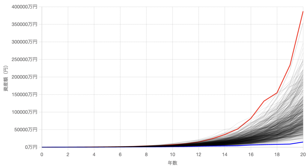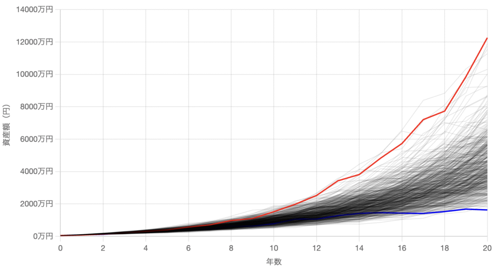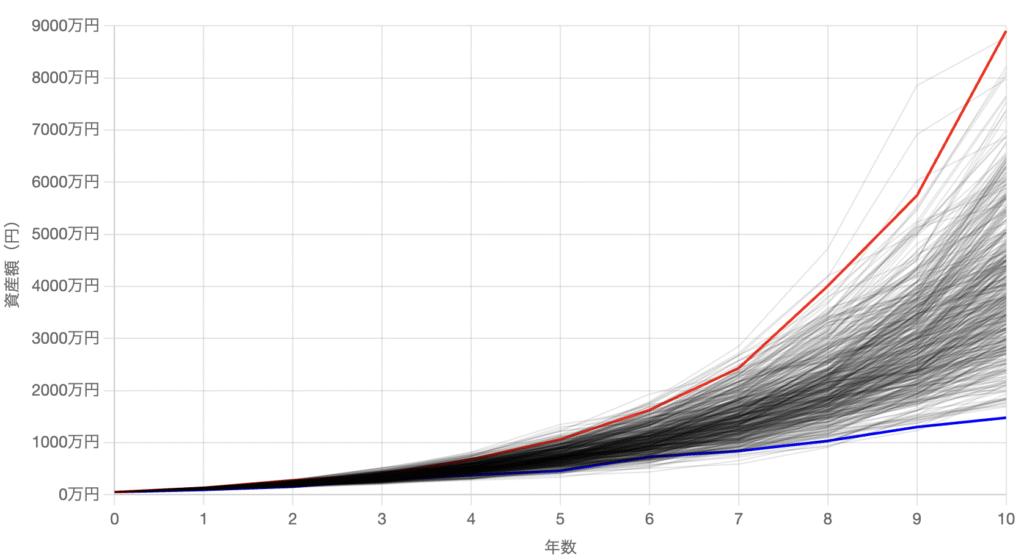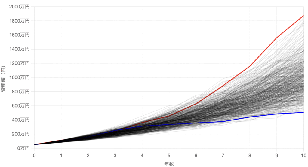 | シミュレーション回数 | 500回(上記のリスクと正規分布に従って年利をランダムに変動) |