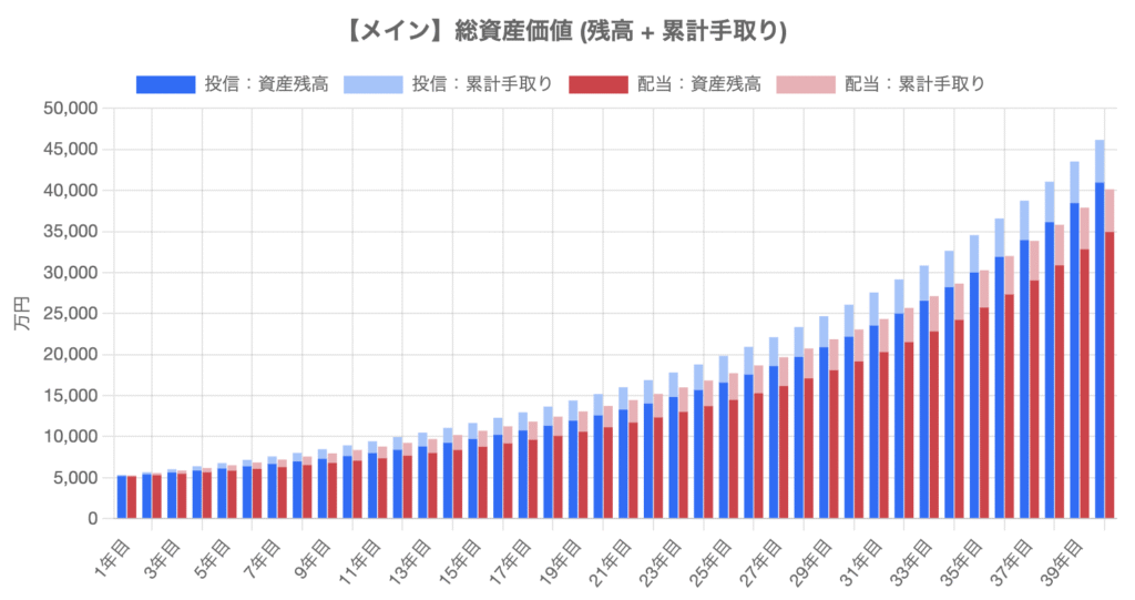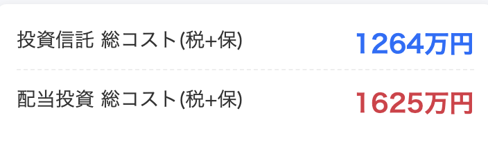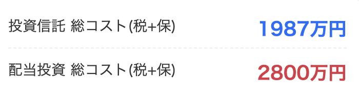 投資信託の残資産は配当より3155万円も大きい結果になっており、配当投資と大きな差が出ています。