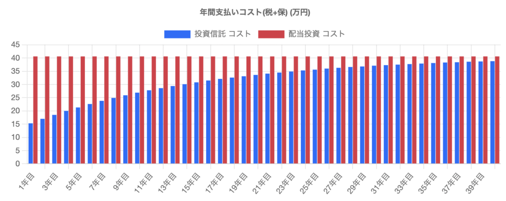 グラフの縦軸が高ければ高いほど税負担が大きいので、40年間通してずっと投資信託の方が税負担は安いです。