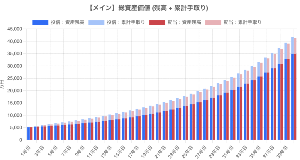 そして、残った資産額と手取り額の累計をグラフにすると下画像のようになります。
