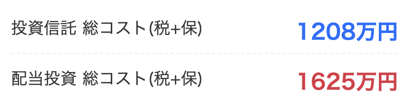 20.315%の税金だった時は差額が417万円だったので、増税によって配当と取り崩しで100万円以上のコスト差がさらに生まれています。