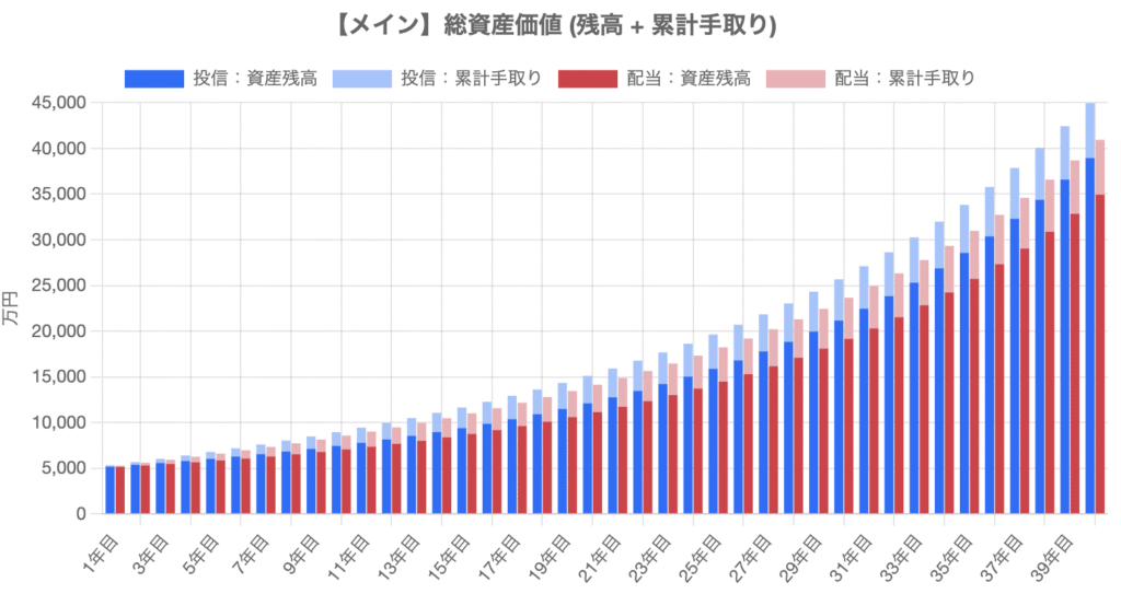 このシミュレーションでは配当と取り崩しで額面上は同じにしてあるので残資産は同じ結果になっており、累計手取り額で361万円の差が生まれる結果になっています。