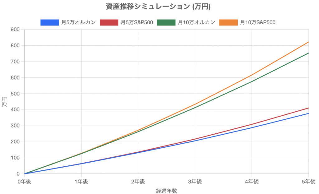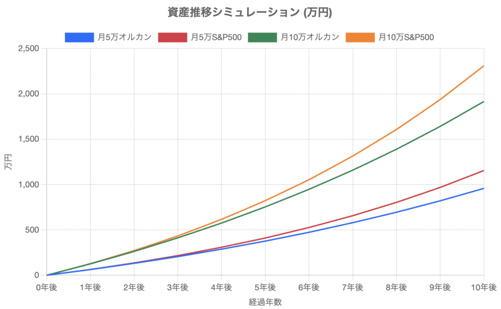 例えばオルカンだけを抜き出して月5万円と10万円をより詳細に比べると下記のようになります。