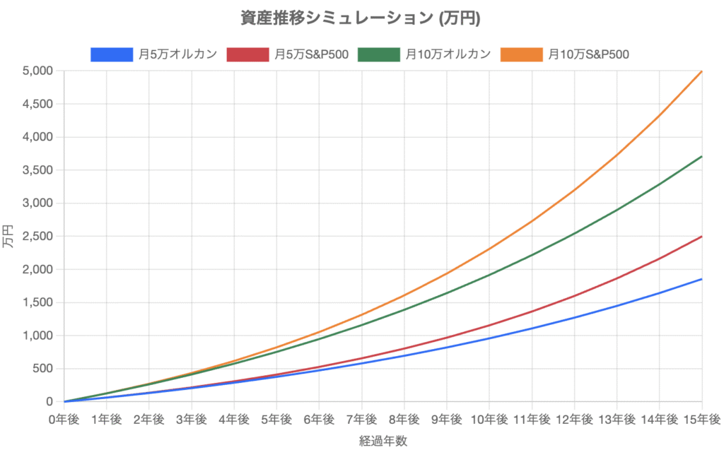 しかも、さらに恐ろしいのは15年間の複利効果があっても月5万円のS&P500は月10万円のオルカンには勝てないということです。