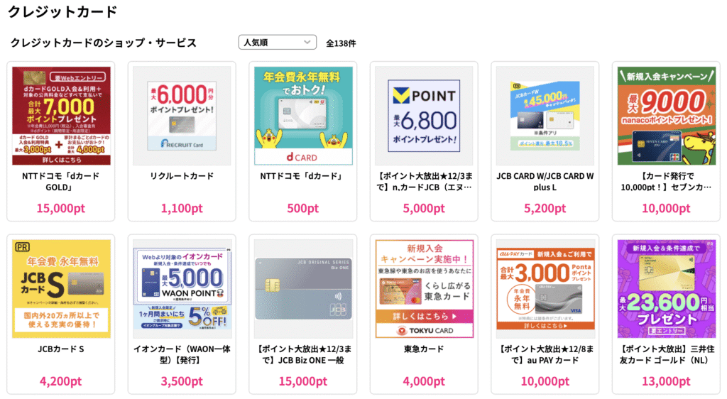 クレカや証券口座は企業の広告費が高いのでハピタスでのポイント還元も大きい傾向にあります。