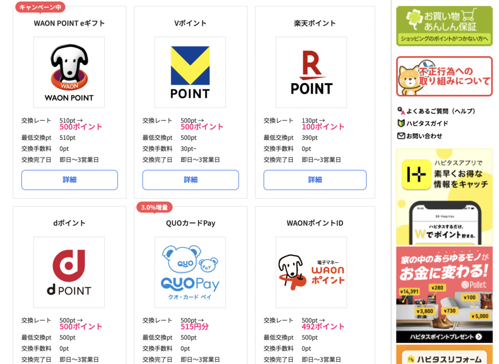 例えばハピタスでは下画像のように様々な会社のポイントへ直接交換することが可能です。