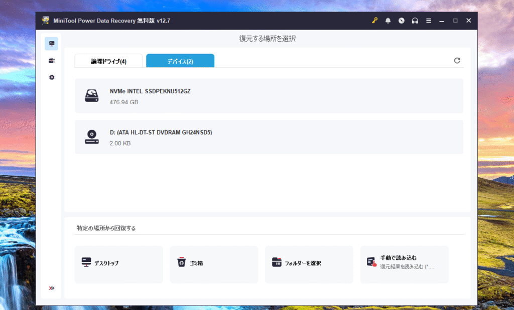 起動すると「復元する場所を選択」画面が表示され、「論理ドライブ」と「デバイス」の2つに分かれた状態でパソコンに接続されている全ドライブが表示されます。