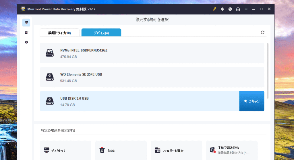 データを失った場所(例:Cドライブ、USBメモリなど)を選択してスキャンを開始していきます。