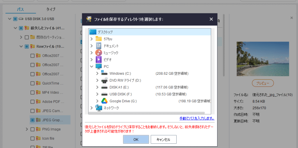 復元するためのファイル保存先を選べるので、復元先を自由に選択し、「OK」ボタンをクリックします。