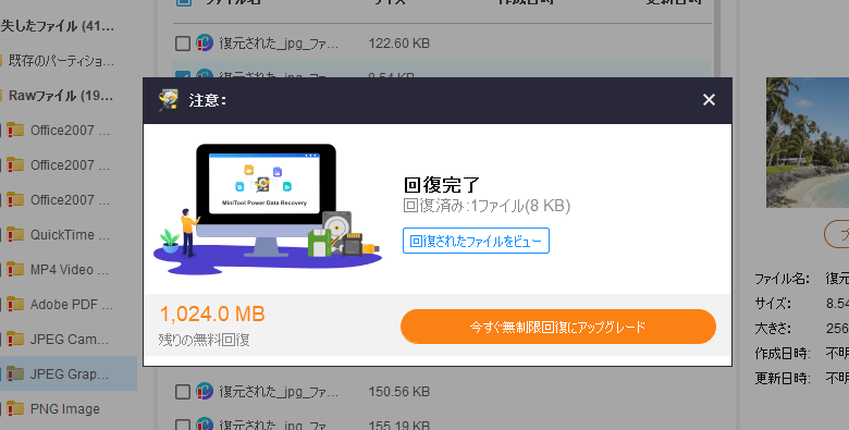 MiniTool Power Data Recovery無料版では1GBまでのデータを復元できます。