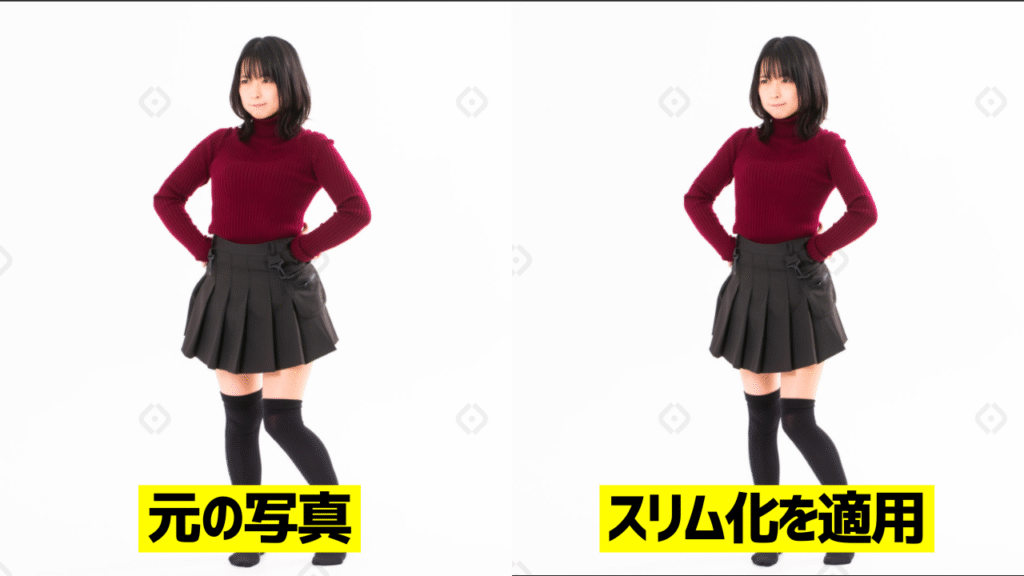 今回は顔の大きさを全く変えていない状態で体型のみスリム化をしていますが、かなり自然な形でスリム化できていると思います。
