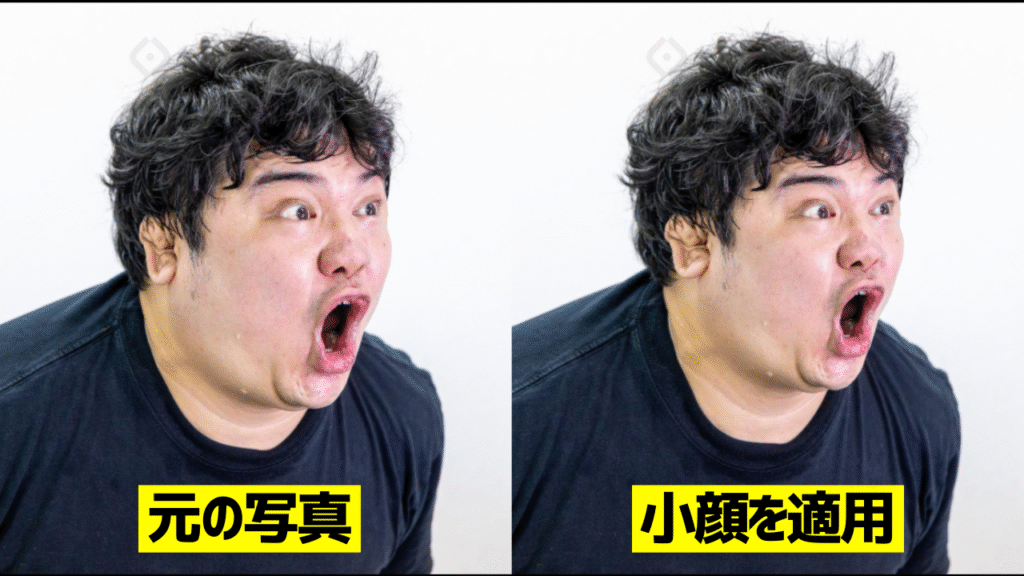 実際に先ほどから使ってるフリー画像で小顔の値バーを動かすと下画像のように変化します。