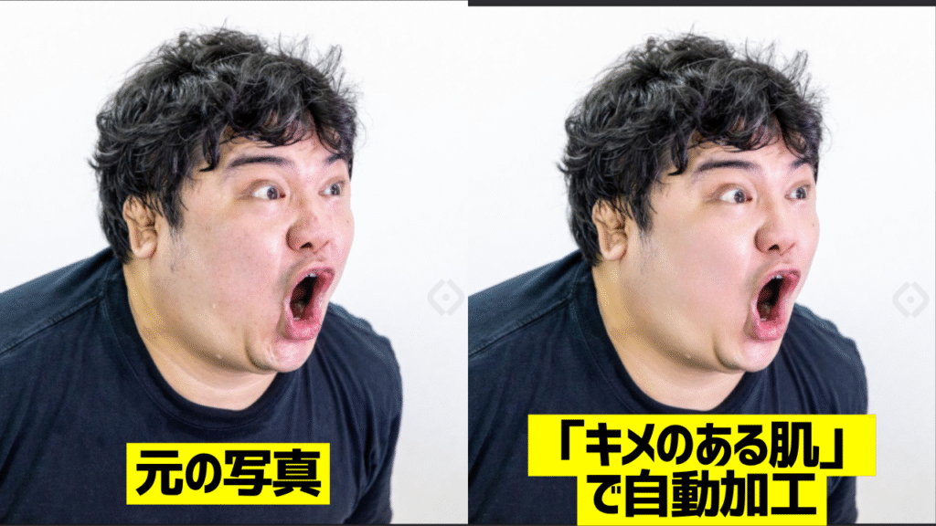 例えば補正したい画像をアップして「キメのある肌」というプリセット(画像加工のテンプレートのこと)をクリックするだけで下画像のように自然な加工が可能です。