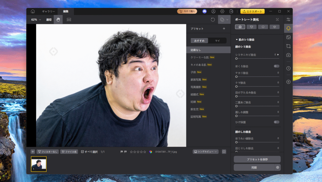 一方で、上画像の右側にある「肌のシミ除去」や「肌の調整」などは各項目の値が設定されており、バーを動かすだけでAIが自動で加工してくれます。
