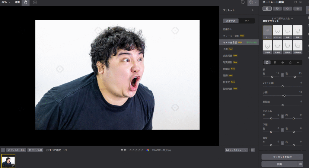 どれくらいの加工をするかは微調整可能なので、気になる部分だけ修正したい方や加工にこだわりがある方は気になる項目から加工すると良いでしょう。