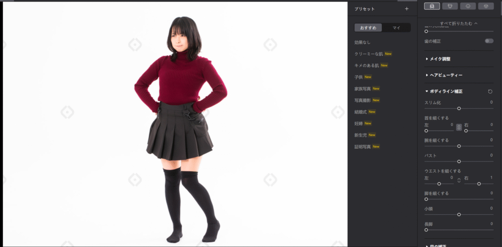 また、ボディライン補正には下記の項目があり、気になる部分のみ加工することも可能です。