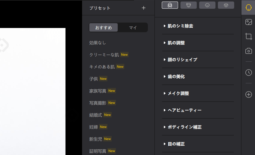 Tenorshare PixPrettyには下画像のように「プリセット」と各パーツに合わせたAI自動加工の機能が搭載されています。