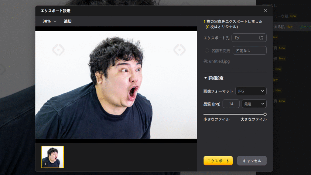 あとは「エクスポート」をクリックすれば指定した保存先に加工した画像が保存されます。