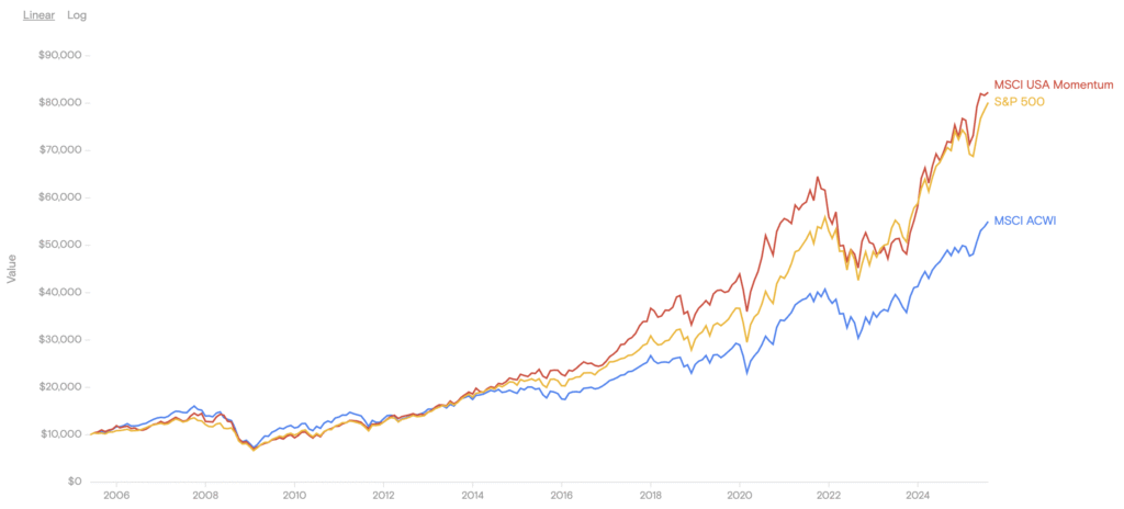 MTUMは過去20年間のリターンでS&P500を超えており、モメンタム投資が時価総額で判断する一般的な投資にも勝てうることを証明しています。