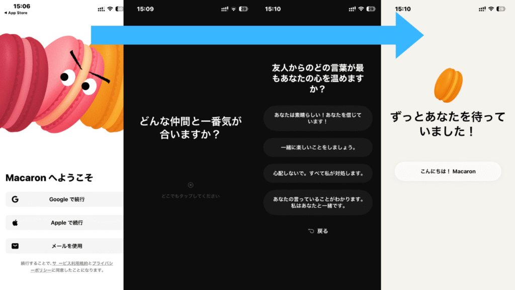 Macaron AIはAppStoreやGooglePlayStoreで配信されており、検索してインストールすると下画像のような流れでアプリの利用を始めていきます。