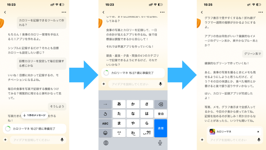 「カロリーを記録できるツールが欲しい」って話しかけるだけで、ミニアプリを作り始めます。