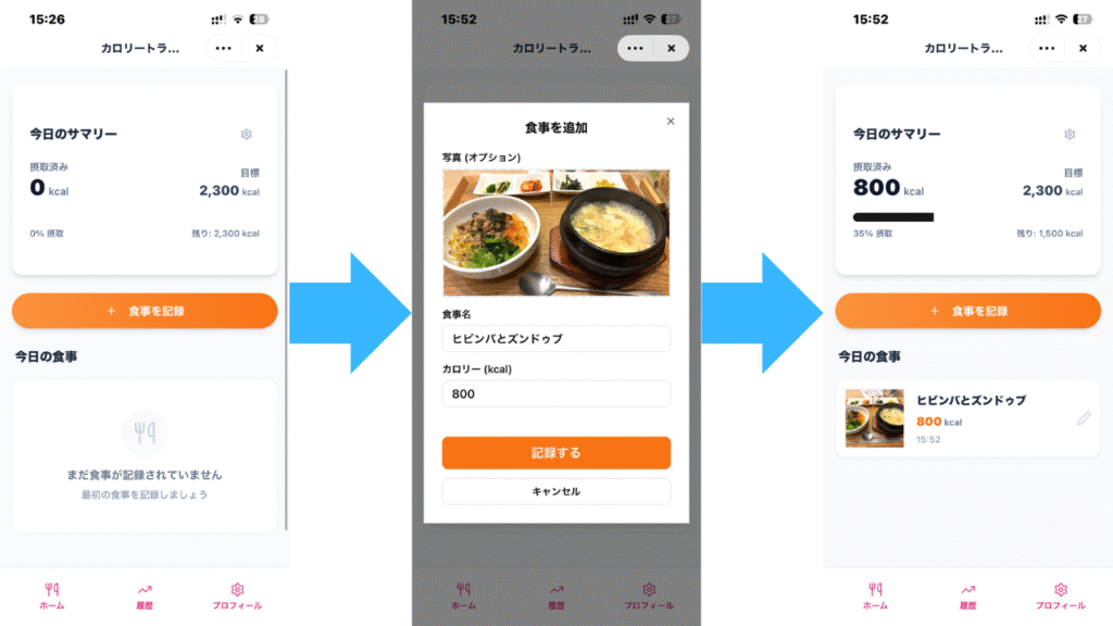 実際にMacaron AIが生成したミニアプリが下画像の通りで、目標カロリーを設定し、毎日のカロリーや写真を記録できるようになりました。