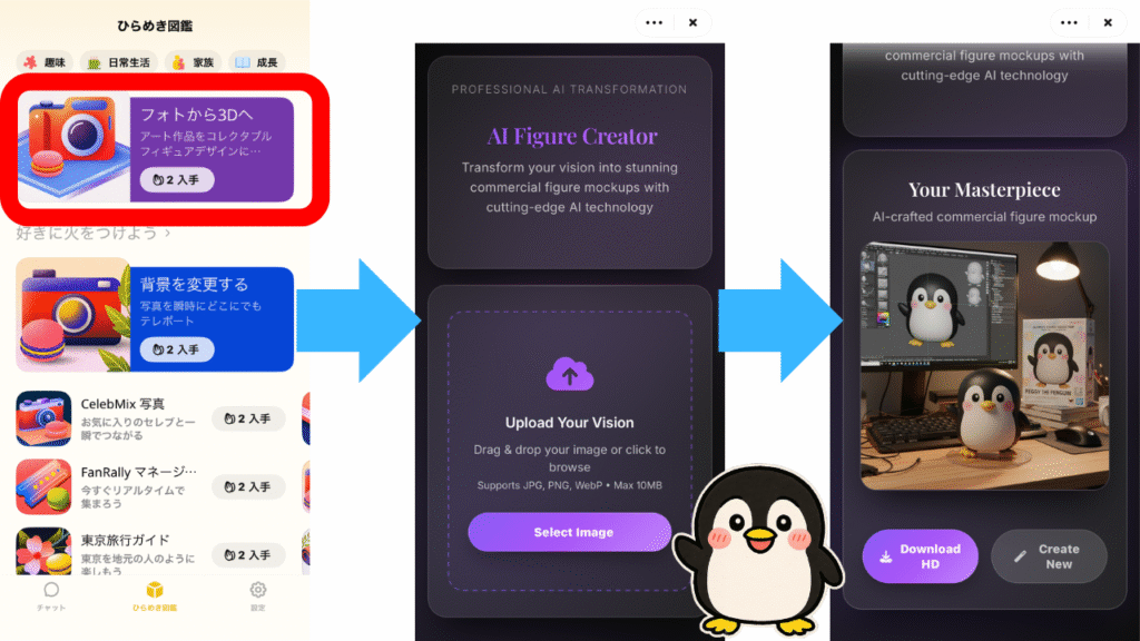 各ミニアプリはアプリ内通貨であるアーモンドを使用することで利用でき、実際に写真を3Dモデルにするアプリを使うと下画像のようにアップした画像を3Dモデルに変換できました。