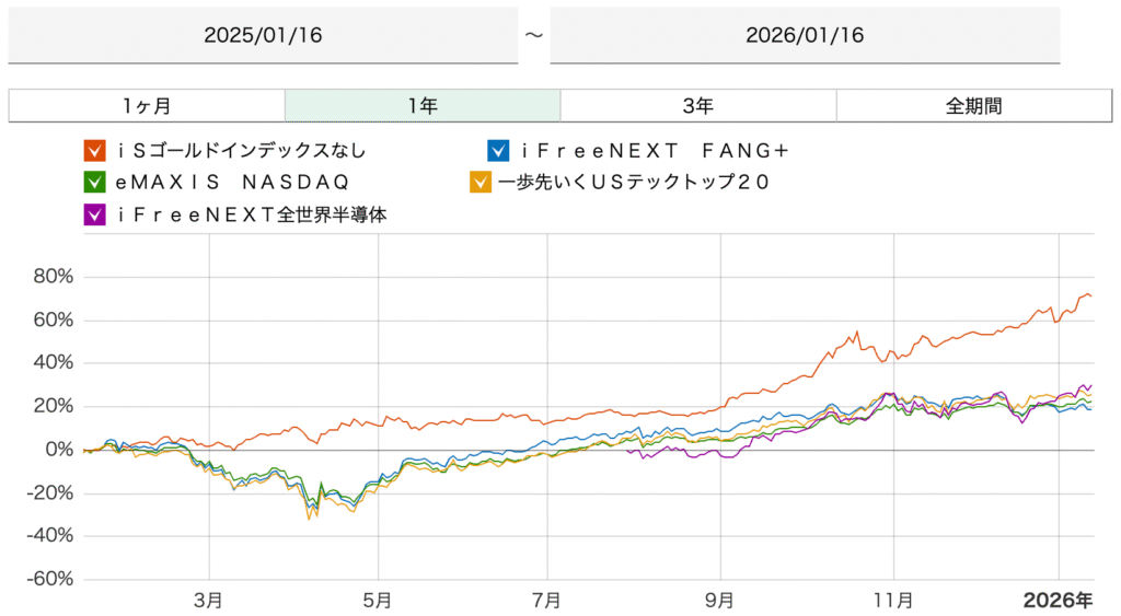 昨年あれだけ人気だったFANG+が他よりも悪く、S&P500やオルカンなどのド定番ファンドにも負けています。