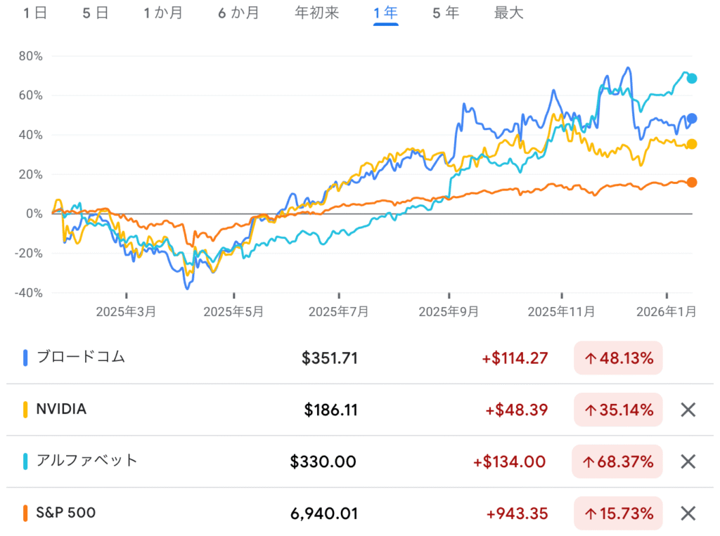 ご覧の通り、アルファベットは+68%、ブロードコムは+48%、NVIDIAは+35%と、いずれもS&P500(+15.73%)を大きく上回っています。