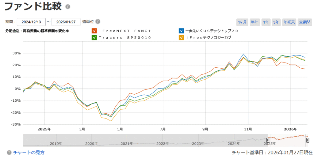 SNSでも「FANG+をやめた」「他のファンドに乗り換えた」という声が増えており、いわゆる「FANG+離れ」が起きているようです。