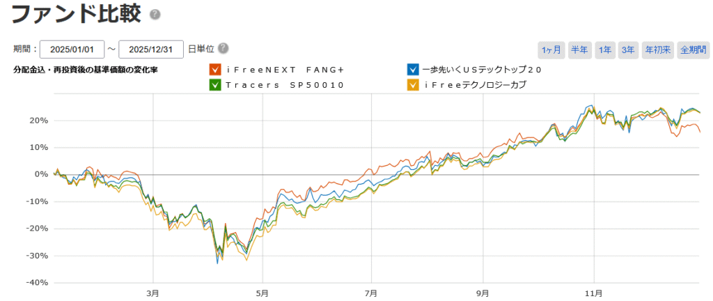2025年は株式市場全体としては堅調でしたが、FANG+は他の指数と比べて相対的に控えめな成績でした。