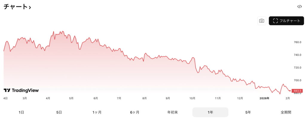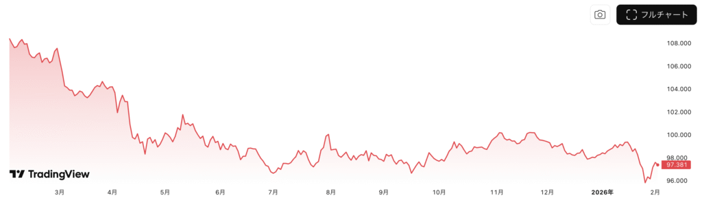 2025年はまさにこのパターンが発生し、ドル指数が下落する中で新興国株は+30%以上のリターンを記録しました。(下画像は直近1年でのドル指数)