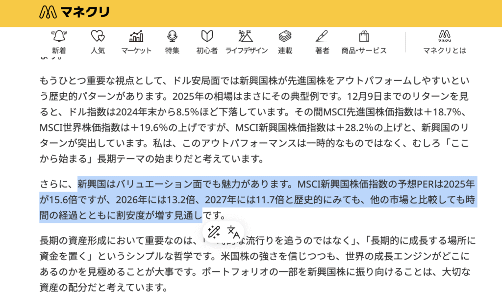 マネックス証券の岡元氏によると、MSCI新興国株価指数の予想PERは2025年の15.6倍から2026年には13.2倍、2027年には11.7倍へと低下する見通しです。