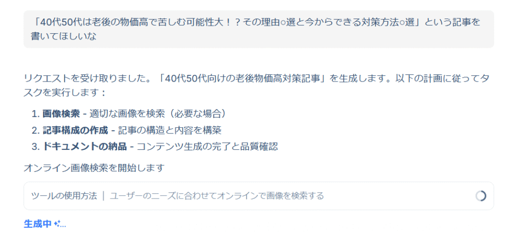 試しに「40代50代は老後の物価高で苦しむ可能性大!?その理由○選と今からできる対策方法○選」というテーマで書くように指示を出してみました。