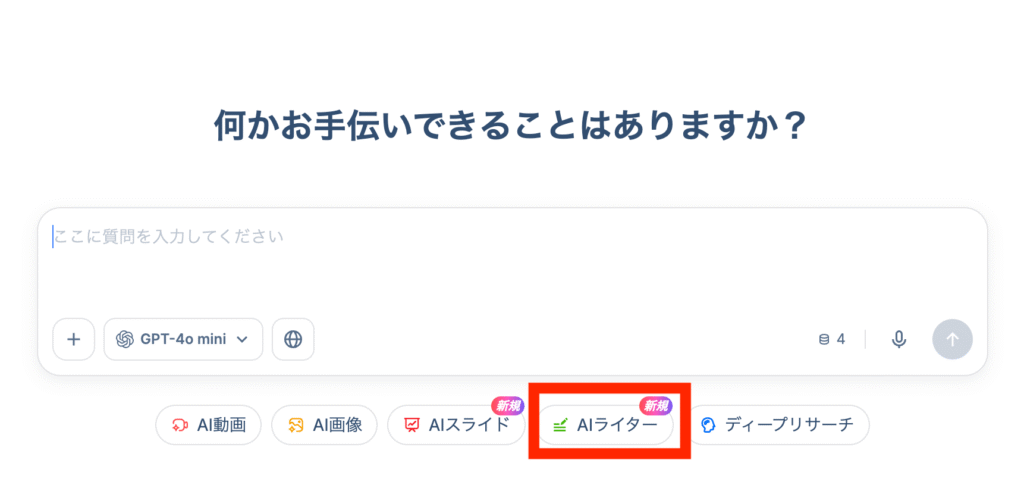 下画像の赤枠で囲んだAIライターを選択すると利用できます。