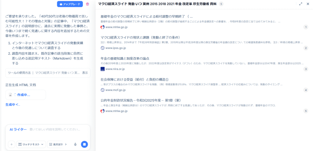 AIライターは単なる文章生成ツールではなく、リサーチから編集、フォーマット適用まで一貫して行えるため、AIエージェントとして利用できる点が特徴的でした。